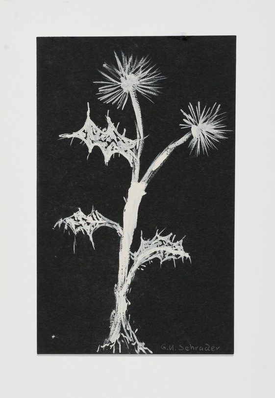 Zeichnung, weiße Tusche auf schwarzem Karton