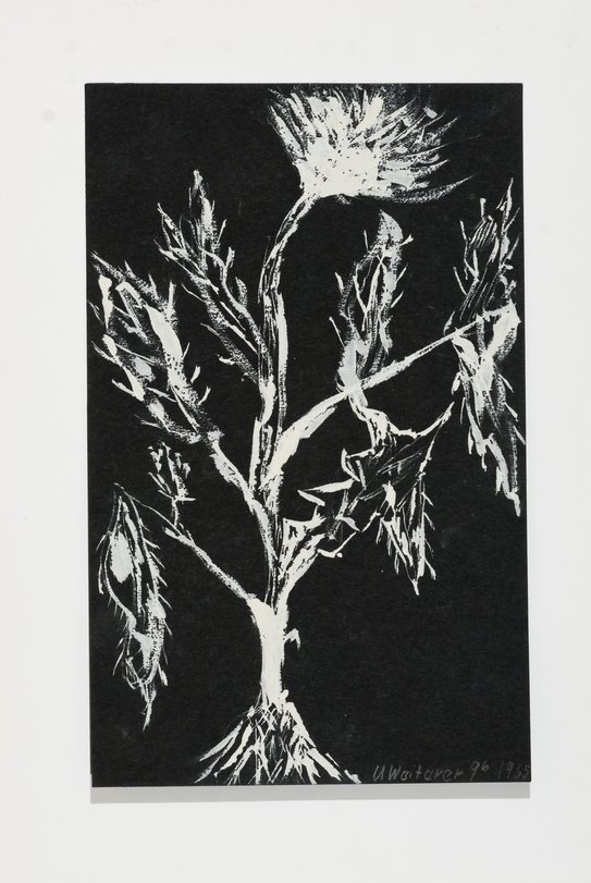 Zeichnung, weiße Tusche auf schwarzem Karton