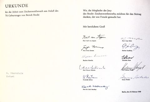 Urkunde zum Bertolt-Brecht-Wettbewerb im Original